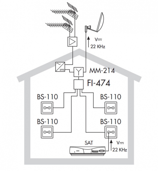 Делитель на 4 выхода. Для использования в эфирной и спутниковой кабельной сети. Проход питания и сигнала DiSEqC по всем выходам с диодной развязкой.